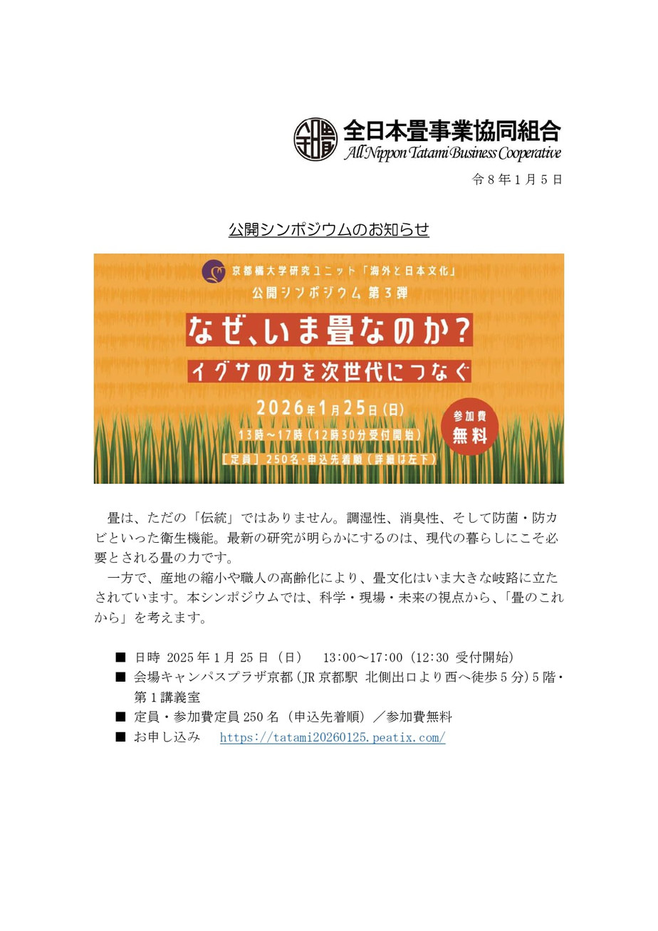 「なぜ、いま畳なのか? — イグサの力を、次世代につなぐ--」公開シンポジウム全日本畳事業協同組合3 日前読了時間: 0分「なぜ、いま畳なのか? — イグサの力を、次世代につなぐ - 」公開シンポジウム_compressed.pdfダウンロード:PDF • 142KB